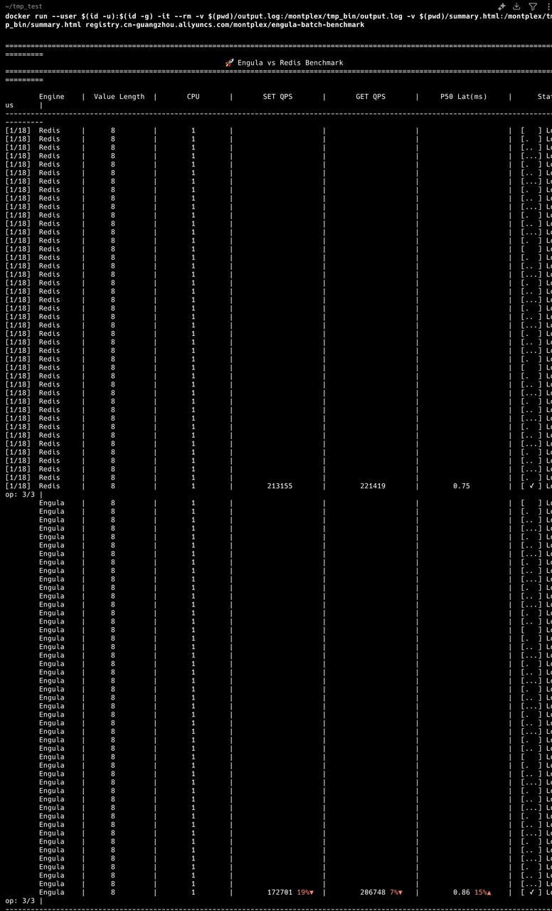 Since there are a total of 18 comparison groups, with Redis and Engula tested serially in each group, and each group tested 3 times, the entire test takes approximately 40 minutes to complete.